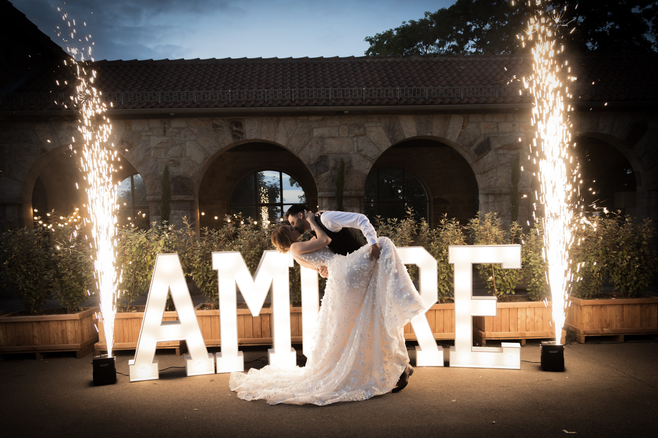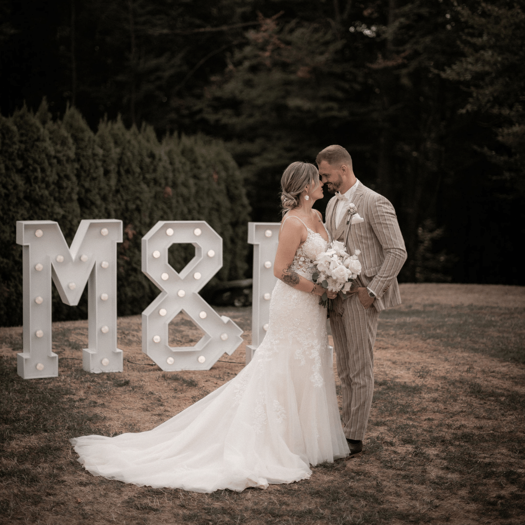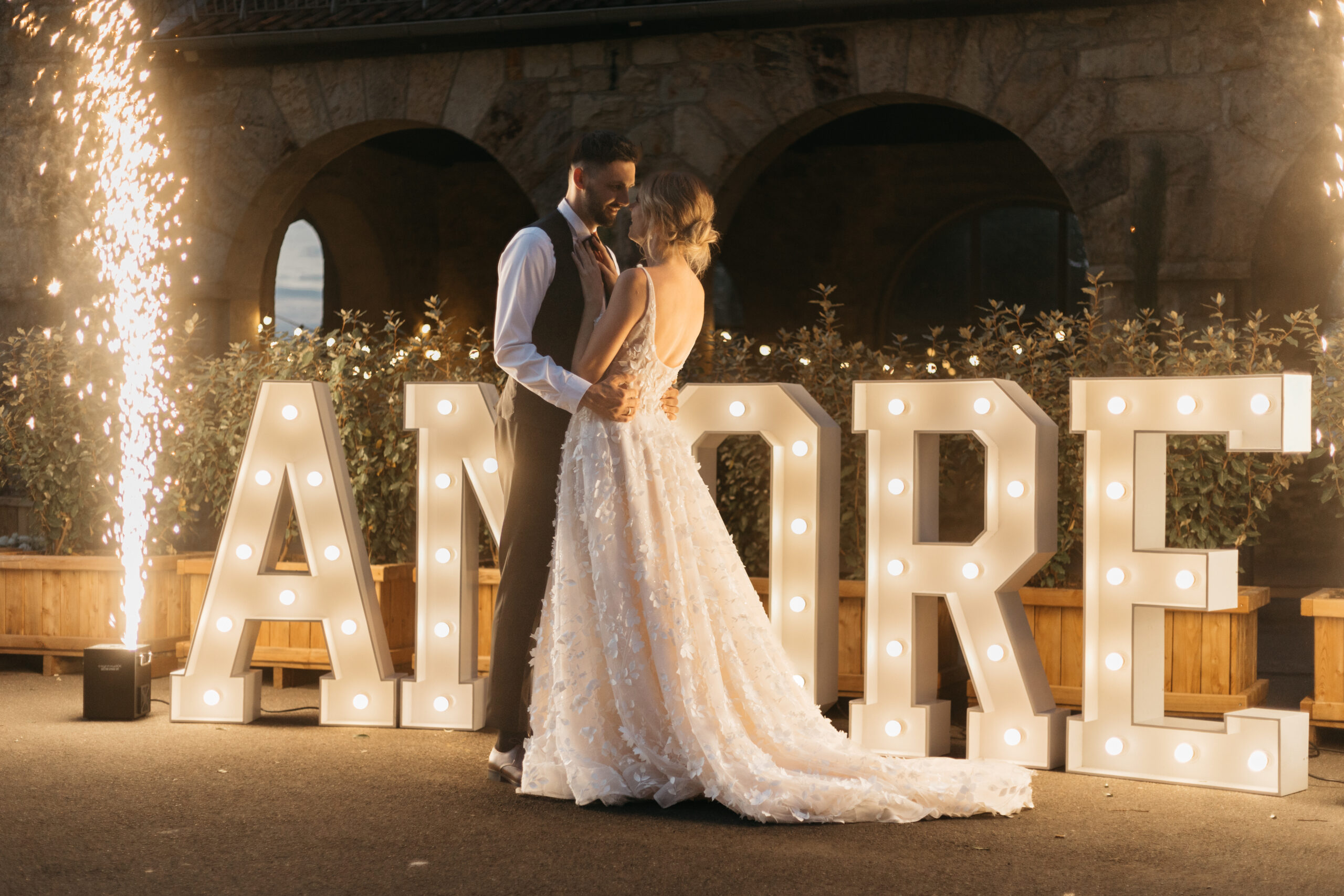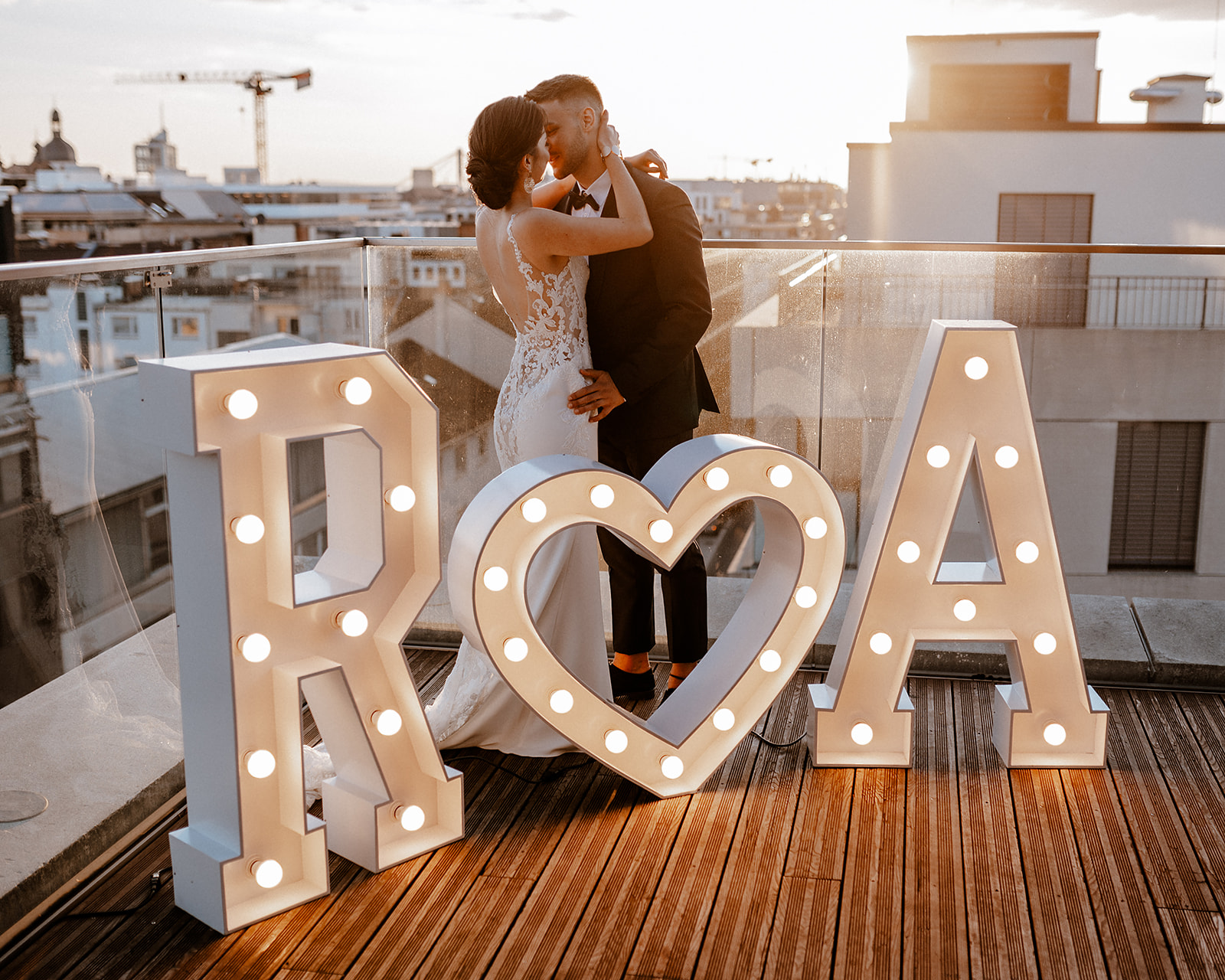 Unsere Leuchtbuchstaben sind Tag UND Nacht ein optisches Highlight. Sie sind sowohl ein stylisches Deko-Element als auch ein richtig toller Foto-Hintergrund für Eure Hochzeit oder Feier.
