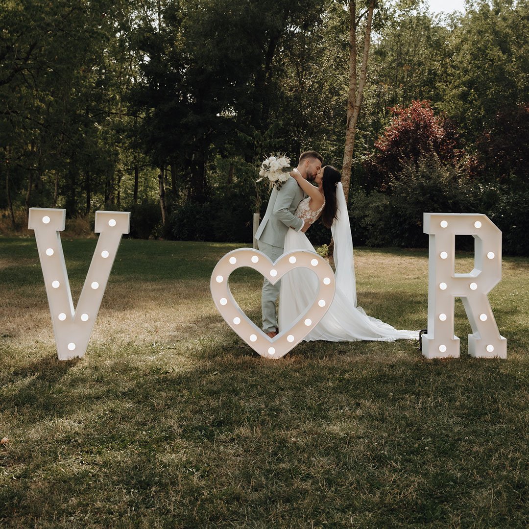 Durch die Leuchtbuchstaben könnt Ihr Eurer Feier einen ganz persönlichen Touch geben oder Stimmung erzeugen. Auch ein Highlight: unser großes Herz, das auch als Durchgang oder Traubogen genutzt werden kann.